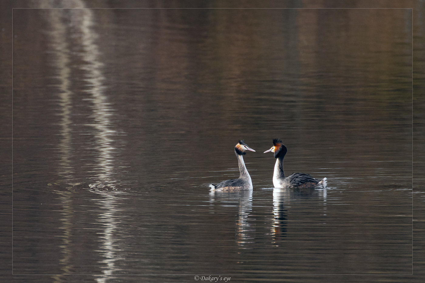 Parade nuptiale du Grèbe huppé, un moment très codifié actuellement sur l’étang de la POUGE.
