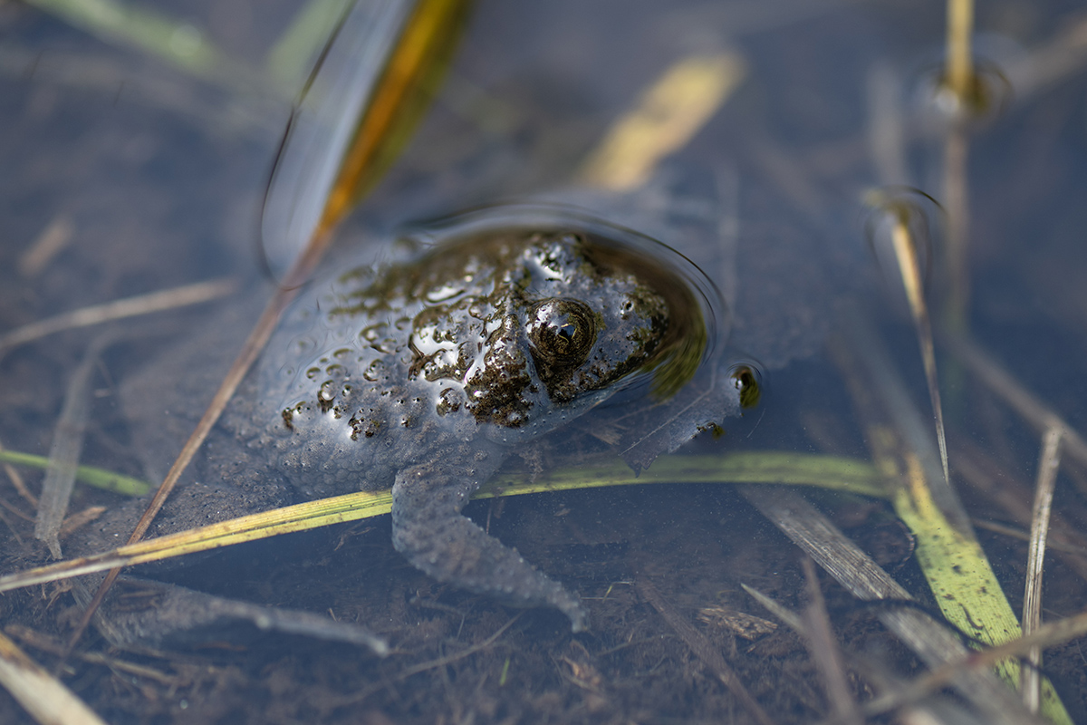 Bombina variegata ou crapaud sonneur à ventre jaune, sa face ventrale jaune n'est pas visible sur la photo par contre la pupille de son oeil en forme de coeur l'est.