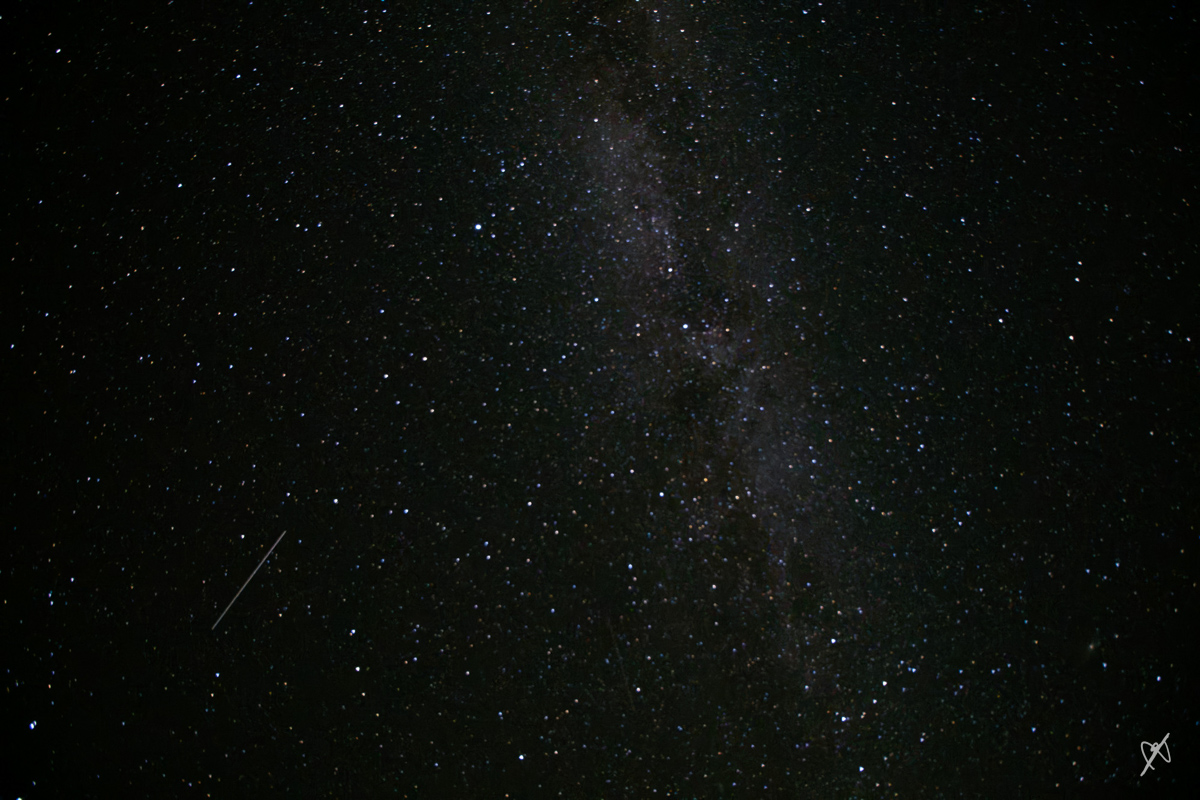 Un expérience ! D'abord, je ne suis pas bien équipé pour ce genre de photo. Il faut un grand angle lumineux. Mon objo le plus lumineux (f1.8) est de 50mm donc beaucoup trop long. Mon grand angle le plus approprié (10mm), est f4.5 maxi, un peu lente. Finalement j'ai essayé le 10mm f4.5. Exposition 30s selon le règle de 500 (500/16mm sur APS) et il fallait ISO6400 pour avoir une image utilisable. Les étoiles ont resté rondes. Deuxième problème, le 10-20mm est un Canon que j’utilise avec un adaptateur Fringer sur le Fuji X-T3, mais il n'y a pas d'indication de point de netteté pour régler à l'infini donc j'ai du faire la mise au point par viser un objet assez loin, environ 2km, et de tourner la bague de focus un peu de plus. 2km n'est pas très loin à l’échelle galactique...