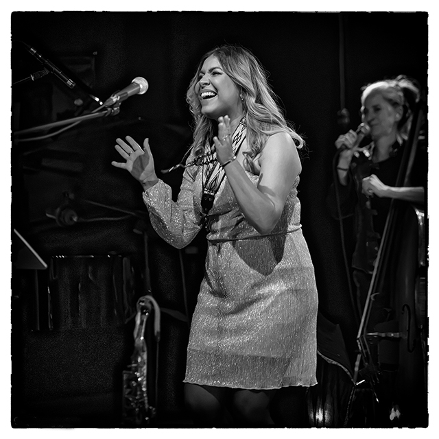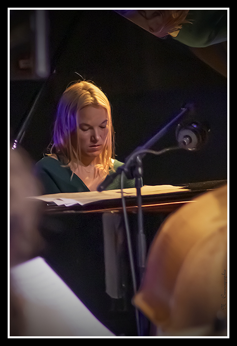 "The Blaquettes" à Dun le Palestel : 4 Nanas dynamiques et sympa, mais une lumière de m ....., et parfois, au milieu d'une forêt de micros en tous genres, le joli minois de la pianiste.