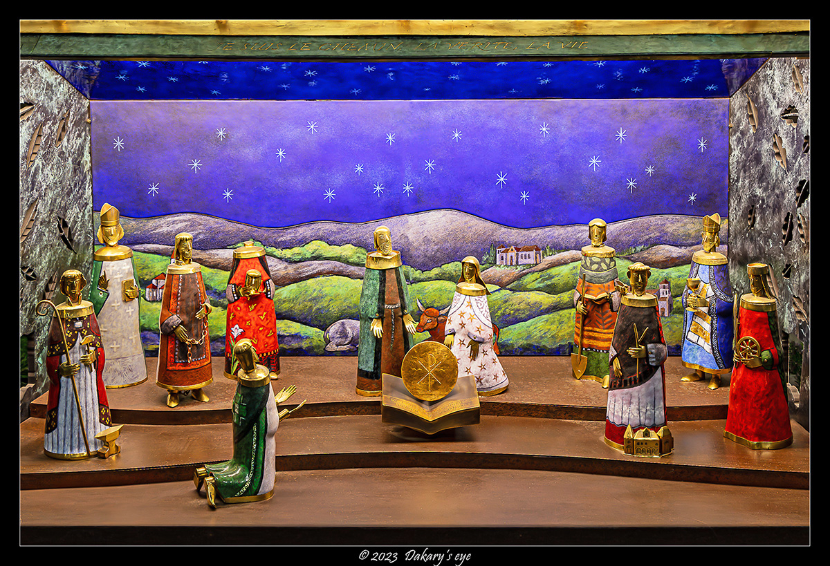 Réalisée en émail sur cuivre par Léa Sham's et Alain Duban, cette œuvre permet de découvrir les figurines de tous les Saints Limousins autour de Marie et Joseph.