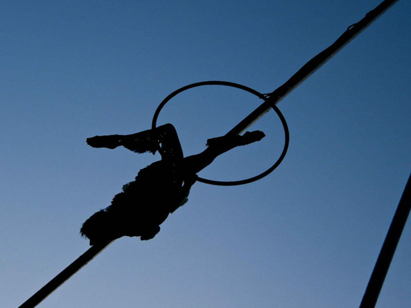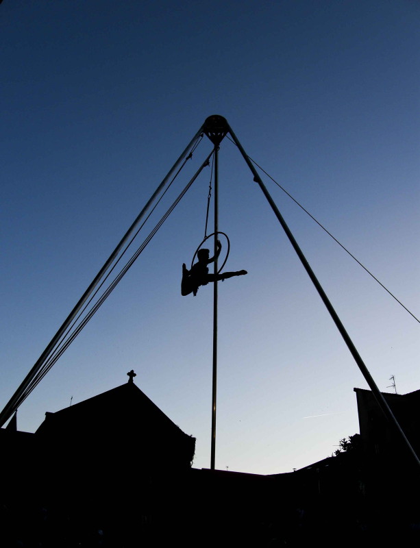 Autre exemple de proposition pour aller plus directement dans ce que tu suggères de manière un peu indécise. Tu peux même virer le câble en travers du ciel et obtenir une vraie diagonale bien propre, ou retravailler encore le cadrage pour mettre ton funambule plus haut, je trouve qu'il est un peu trop bas