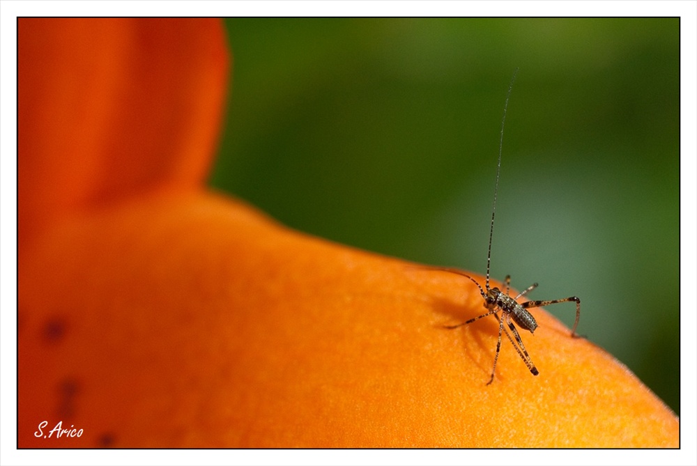 3 photo d'une toute petite sauterelle (??) sur un Iris...