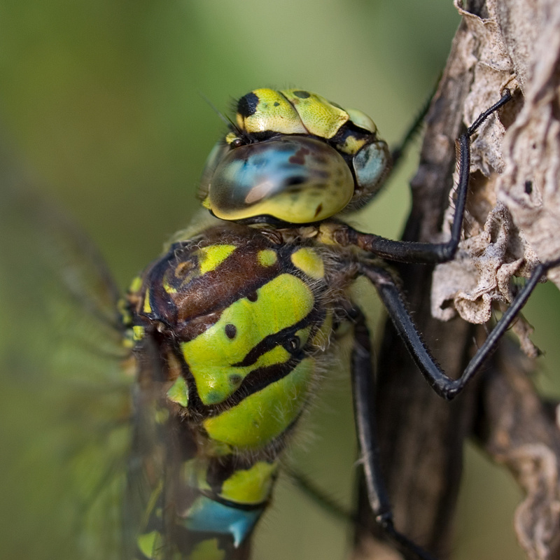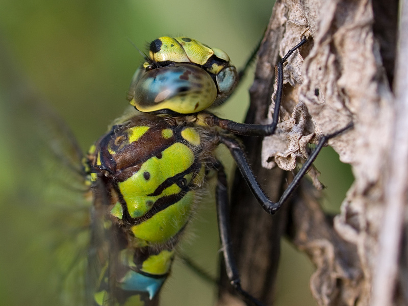 je trouve ton recadrage beaucoup plus convaincant, c'est un peu comme pour un paysage avec horizon, ici le fait de décadrer au lieu de coller le bord du tronc en plein milieu redonne plus d'importance à la libellule et place le tronc comme support et non sujet de la photo. Pour moi il y a suffisamment à regarder avec les nuances de couleurs et les détails mais on rèverait évidemment d'avoir la même chose sur une vue de la bestiole en entier.