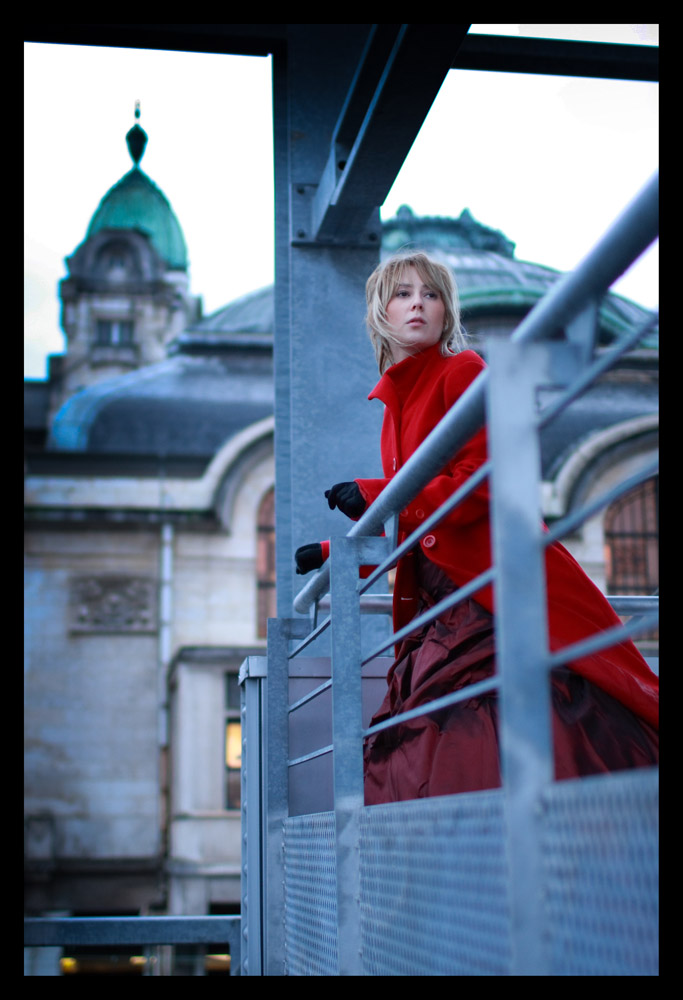 j'aime beaucoup le contraste avec le rouge chaud du manteau et la fraicheur du modele blond et du paysage!