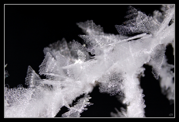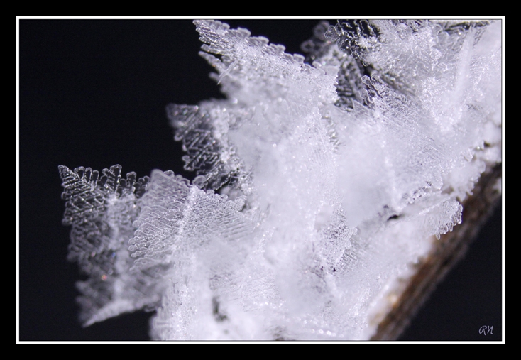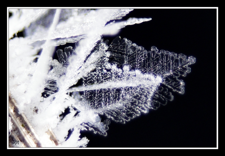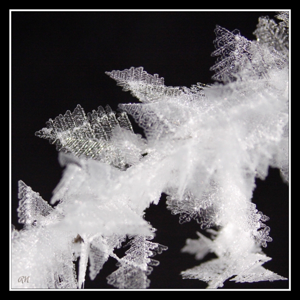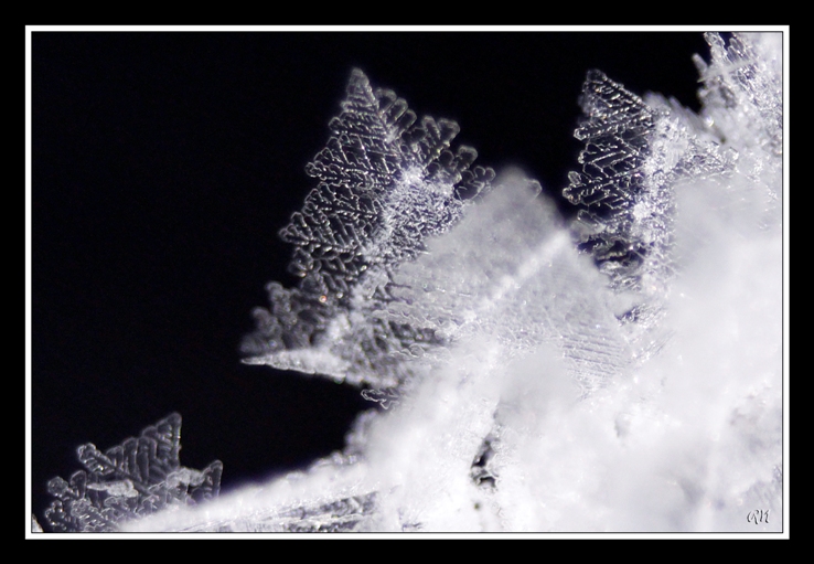 Cristallisations de glace, sur fonds noir ou fonds naturel (taille des cristaux : de 5 à 15 mm)