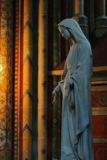 Peut-être qu'une autre prise de vue décalée pour qu'on ne voit que la statue sans les ampoules serait mieux mais bon visiblement il y a un vitrail derrière la statue ce qui limite les angles possibles sans avoir de contre jour.