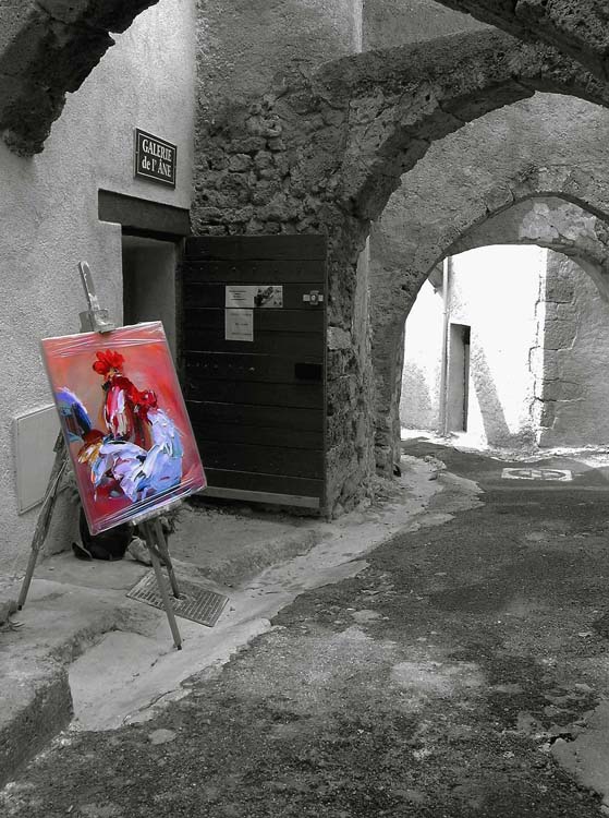 Pour la première, est-ce que cela n'aurait pas valu le coup de colorer également la plaque "Galerie de l'âne", pour mettre en opposition le coq coloré du tableau et l'âne coloré de la plaque ?