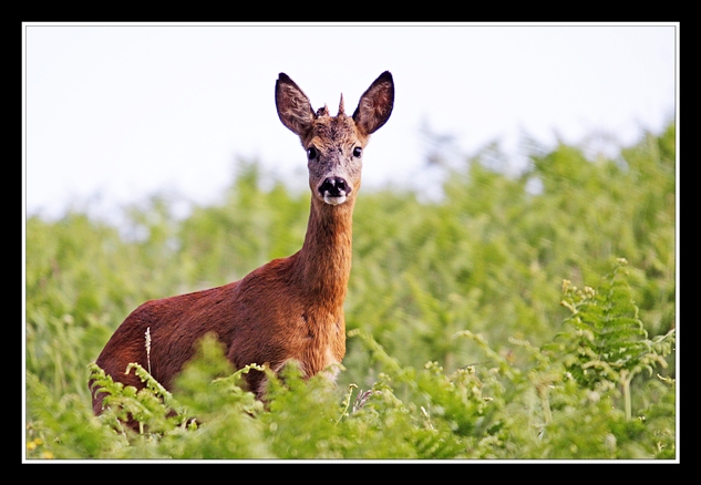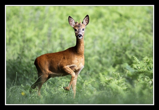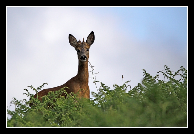 Chevrillard (jeune chevreuil mâle de l'année précédente), mal coiffé, mais très intrigué par ma présence discrète dans les fougères ; je n'ai pas eu à faire d'approche, il est venu lui même au plus près pour satisfaire sa curiosité, et je reconnais que c'est vraiment un instant magique : jusqu'où va-t-il venir ? là, environ 10 à 12 m.