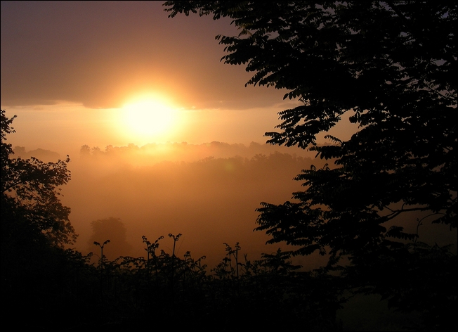 La 1ere, soleil émergeant de la brume matinale m'évoque le matin du monde! La 2eme m'évoquerait plutôt un crépuscule apocalyptique....