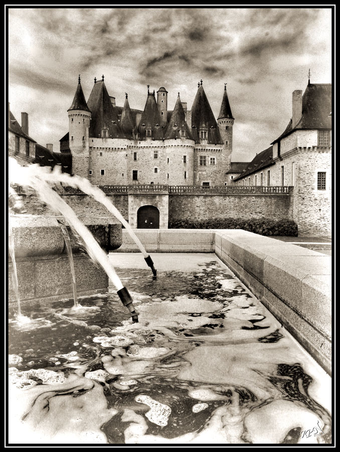 dommage qu'il y ai cette fontaine avec cette vilaine lessive dedans , le reste , château et ciel , me va tres bien.
