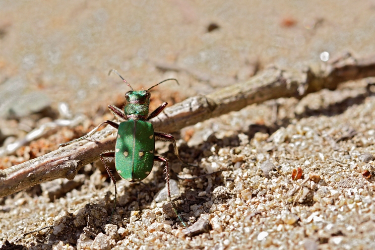 Une cicindèle champêtre (environ 1cm de long), dont un crop sur ses mandibules ; il suffit de l'avoir observée un moment et de l'avoir vue à l'oeuvre pour espérer qu'elle ne deviendra jamais aussi grande que nous : pire que les crocos.