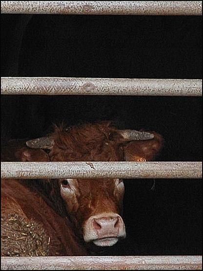 - le cadrage: je comprend bien que tu voulais "fermer" ta photo en haut et en bas avec les barrières, et c'est judicieux, mais du coup le tiers supérieur de la photo est très vide tandis qu'on aimerait (enfin, moi...:P) que la vache soit un peu plus complète... tu vois ce que je veux dire?