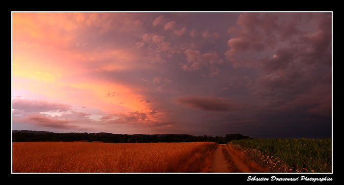 L'éclairage, ce soir là, était vraiment particulier. Cela n'a durée que 3 minutes maxi. Les céréales, déjà bien dorées, étaient éclairées par les reflets orangés projetés par les nuages. Je n'ai rien touché en post-prod hormis les niveaux et le contraste. Pas de saturation supplémentaire (comme j'aime le faire d'autres fois) ou de balance des couleurs pour changer la dominante. Je prends mes photos avec une température de couleur fixe sur le boitier (5600°K), j'ai donc a priori le même rendu que si j'avais pris la photo avec une pellicule diapo Velvia.