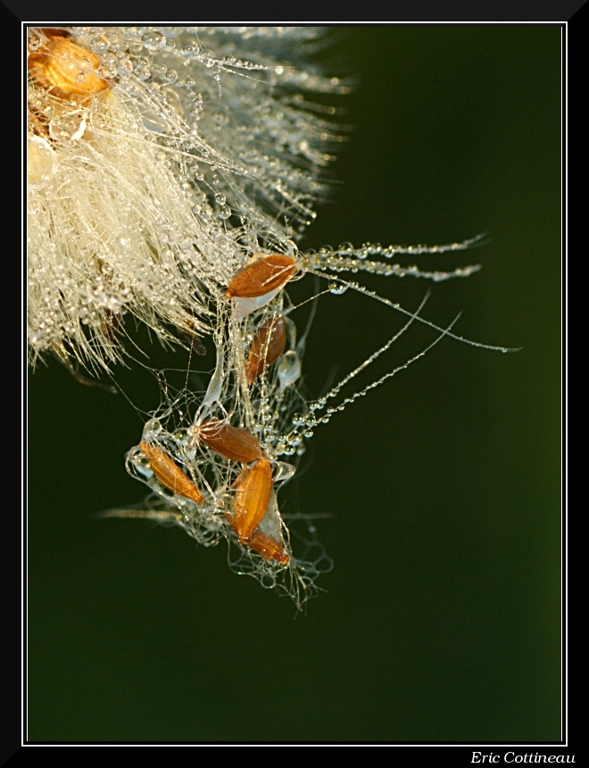 Ce qui m'a attiré l’œil, ce sont les graines qui tombent. Alliées à la rosée, je leur trouve un côté frais, léger qui parle à un terrien de mon espèce. L'eau, les graines, le soleil, la vie qui recommence...
