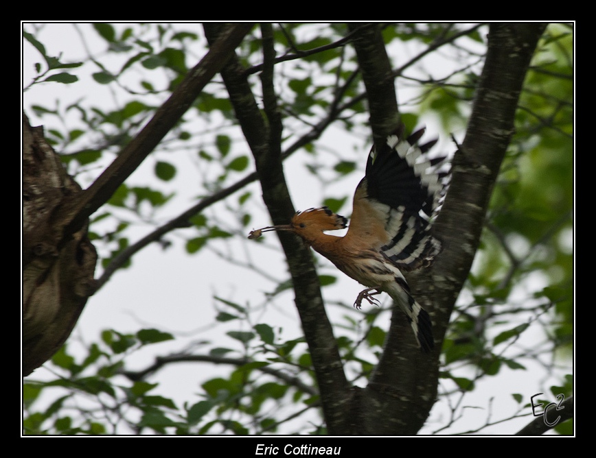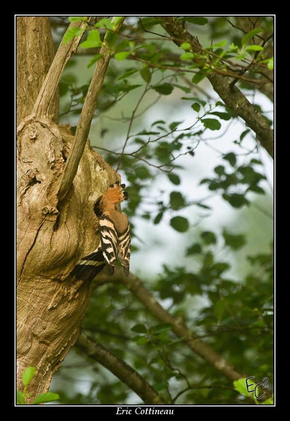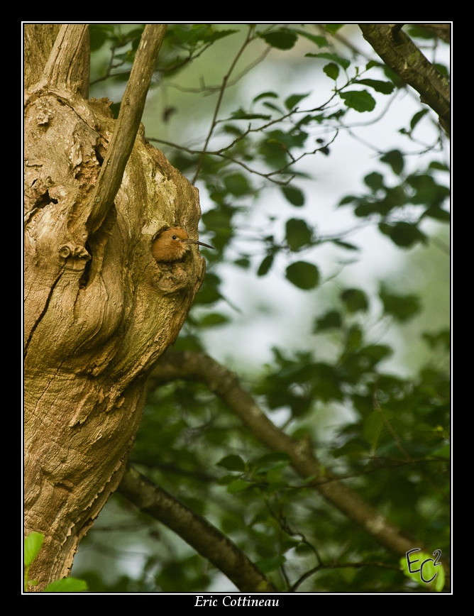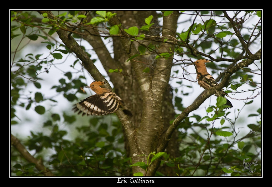 Après une courte attente, une première huppe ( le mâle ?) arrive avec une larve au nid... Aussitôt la seconde passe la tête par le trou pour ensuite sortir par un autre trou.