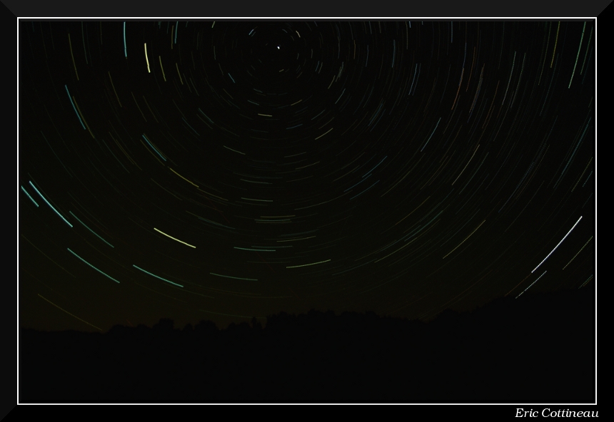 Tout ça est très chouette, il y a sans doute encore à expérimenter, mais ça prends forme ; pour faciliter ton cadrage, je pense que tu peux facilement le faire avant la nuit sur ton premier plan ( le point central sera toujours au centre de ton capteur, à toi de trouver le bon point de vue ) et ne lancer tes déclanchements qu'à nuit bien noire.