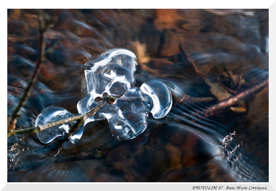 En hiver, la nature prend des formes étonnantes ! J'aime bien cette photo où l'eau à l'air de s'écouler au ralenti comme pour ne pas déranger la fragile pellicule de glace...