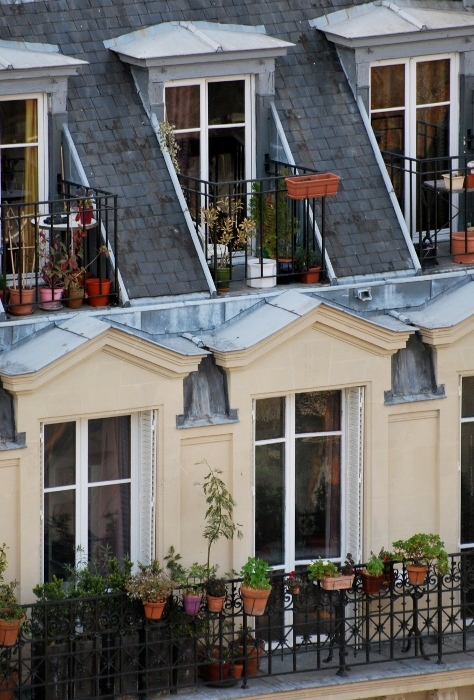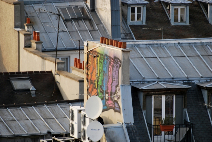 Ensuite, celle de l'immeuble et de ses symétries de façades avec cette perspective. La 3ème, pour le graphisme du sol et la position des personnages et enfin le "tag" avec cet effet de "S" dû au décalage des toits parisiens de zinc et d'ardoises...