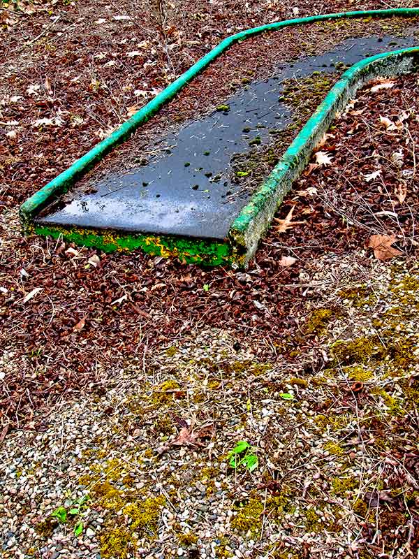 Ah ben mince alors ... c'est pris dans un mini golf à l'abandon, alors qu'il pleut - ce qui fait luire le bitum entre les feuilles :-)