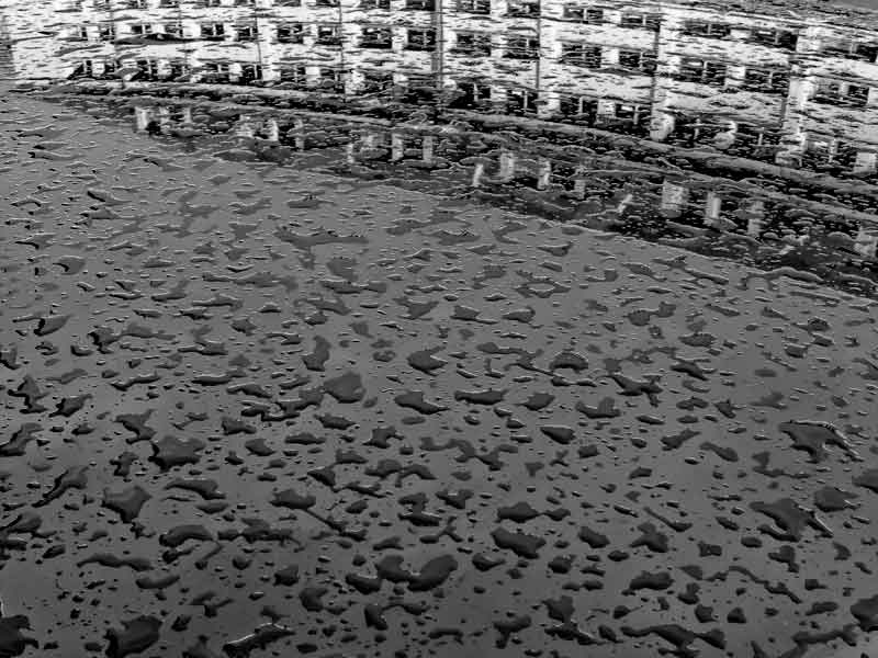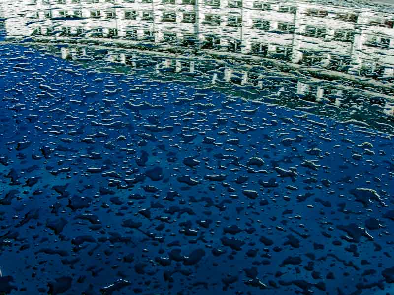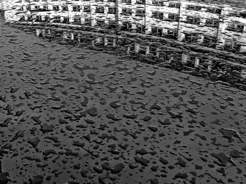 Sans vouloir spécialement m'arréter sur cette image qui ne le mérite sans doute pas plus que cela, il s'agit d'une réflexion sur un toit de voiture, bleu assez foncé ; cela explique sans doute le côté sombre (tu aimes ça, hein ?) des gouttes d'eau ... Voici une version un peu plus subtile en N&B et pour ne frustrer personne, une version couleur ...