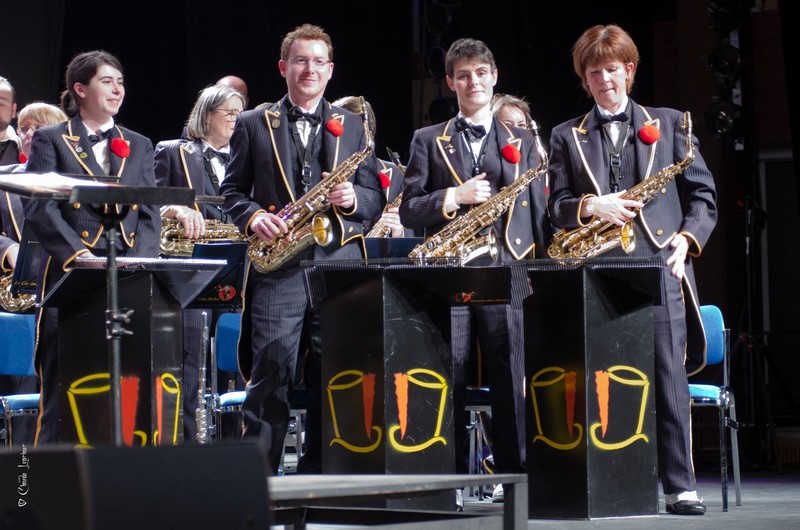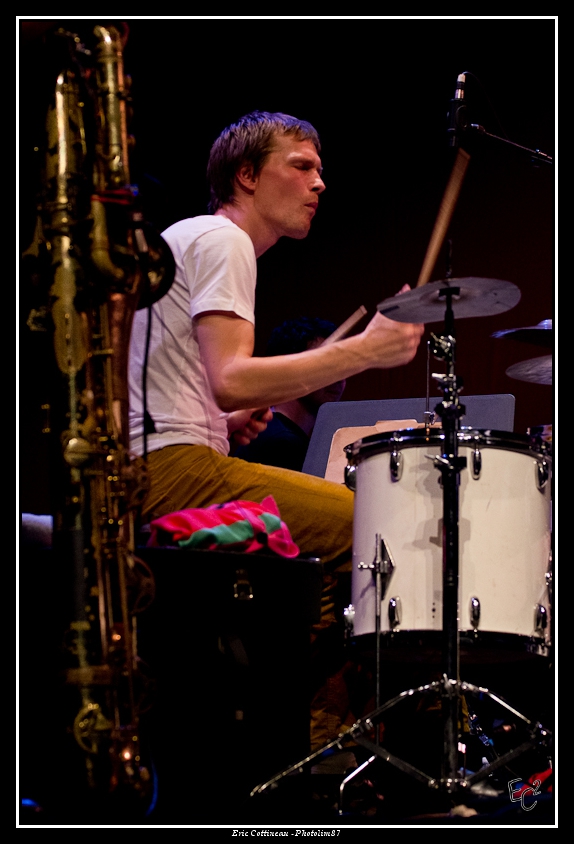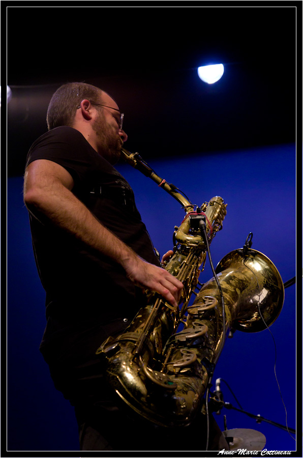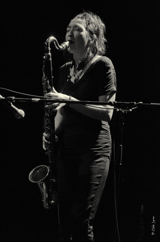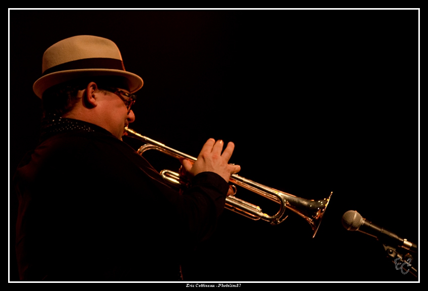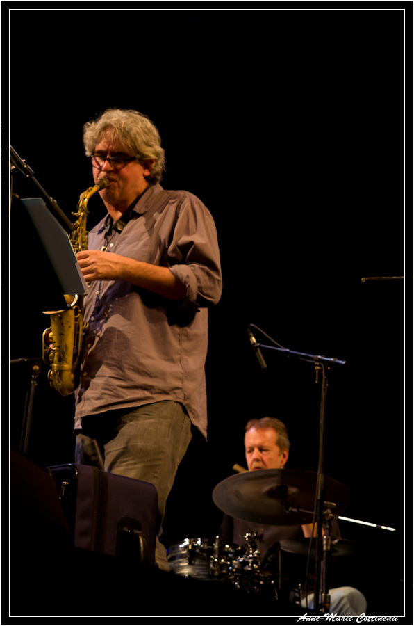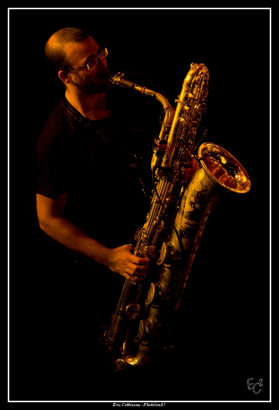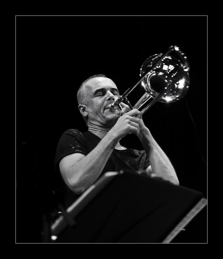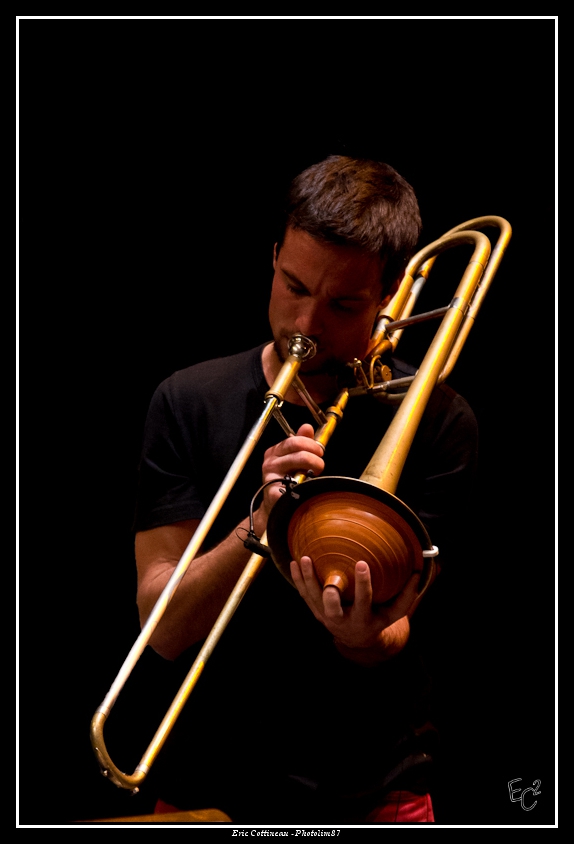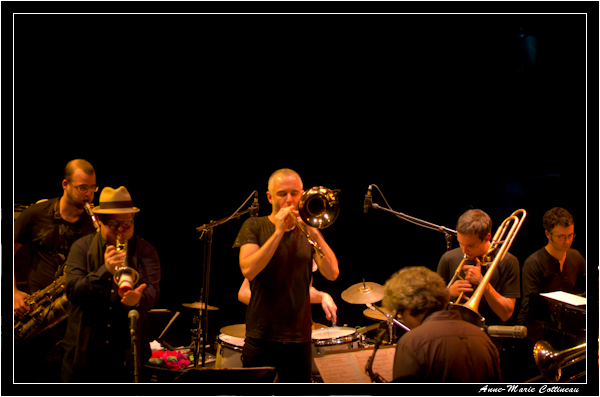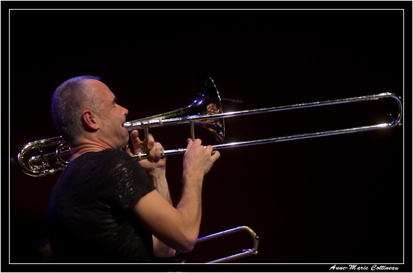 Bravo, beau sax et beau trombone (quoiqu'un peu serré le cadrage). Plateau encombré, ça ne devait pas être facile, et deux morceaux c'est court ! Pas plus de facilité qu'avec les éclairages parcimonieux...