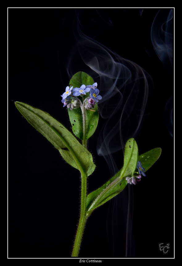 Pour plusieurs raisons : la fumée fait vraiment artificiel là, et si je comprends que tu as voulu habiller le fond, le résultat ne me plait pas. On (je) se (me) demande pourquoi il y aurait de la fumée autour de cette plante... A moins qu'il y ait une relation particulière entre le myosotis et la fumée, auquel cas, pourquoi pas... dans tous les cas, la fumée qui se trouve dans la partie en haut et à droite est en trop je trouve...