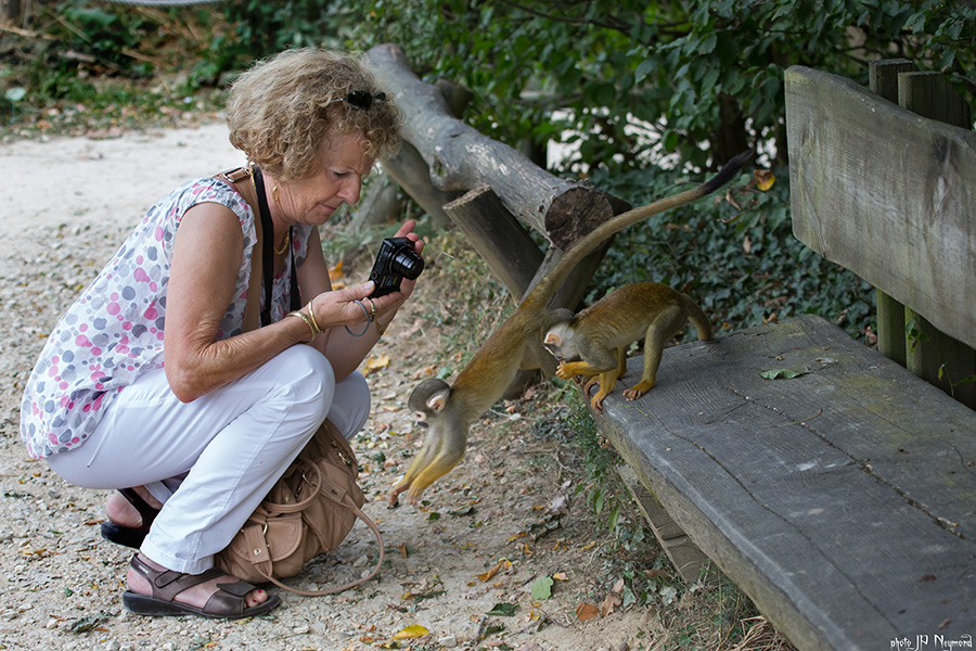 Hors vacances scolaires et en semaine, les animaux sont beaucoup moins sollicités. Les Maki et autres Magots sont approchables à 10 ou 20 cm... on peut même, si on fait pas gaffe se retrouver avec un saïmiri ou un tamarin dans les cheveux... ou dans ton sac à dos... donc un 24-120 est largement suffisant, surtout couplé à un APS/C. Ce Maki couronné est pris à 240mm avec un plein format et non recadré... donc aucun Pb avec un équivalent 180mm. La photo suivante, couple de Mandrill (classée X) est prise au 180mm (plein format), donc en plein dans tes focales possibles. Le Magot est shooté à 100mm...