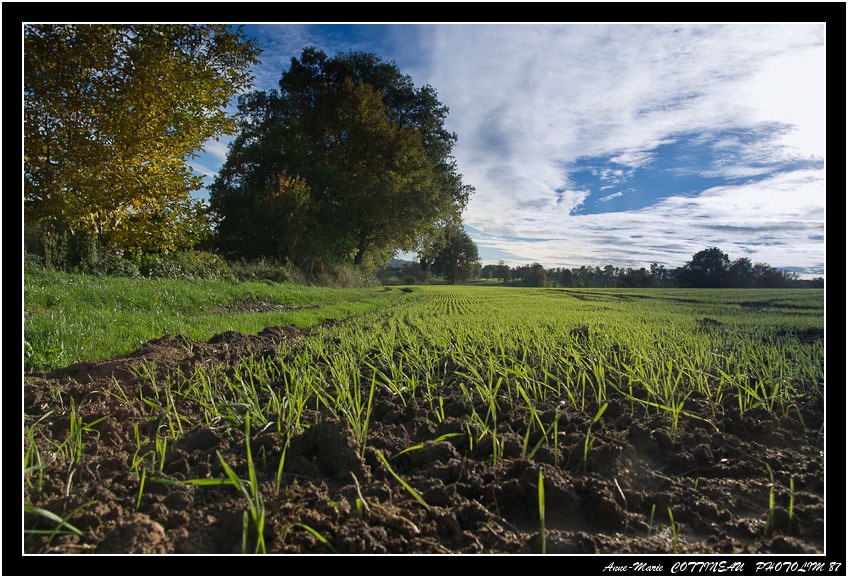 l'automne c'est le temps du semis des céréales... un paysage typique de cette saison : le blé commence à pousser.