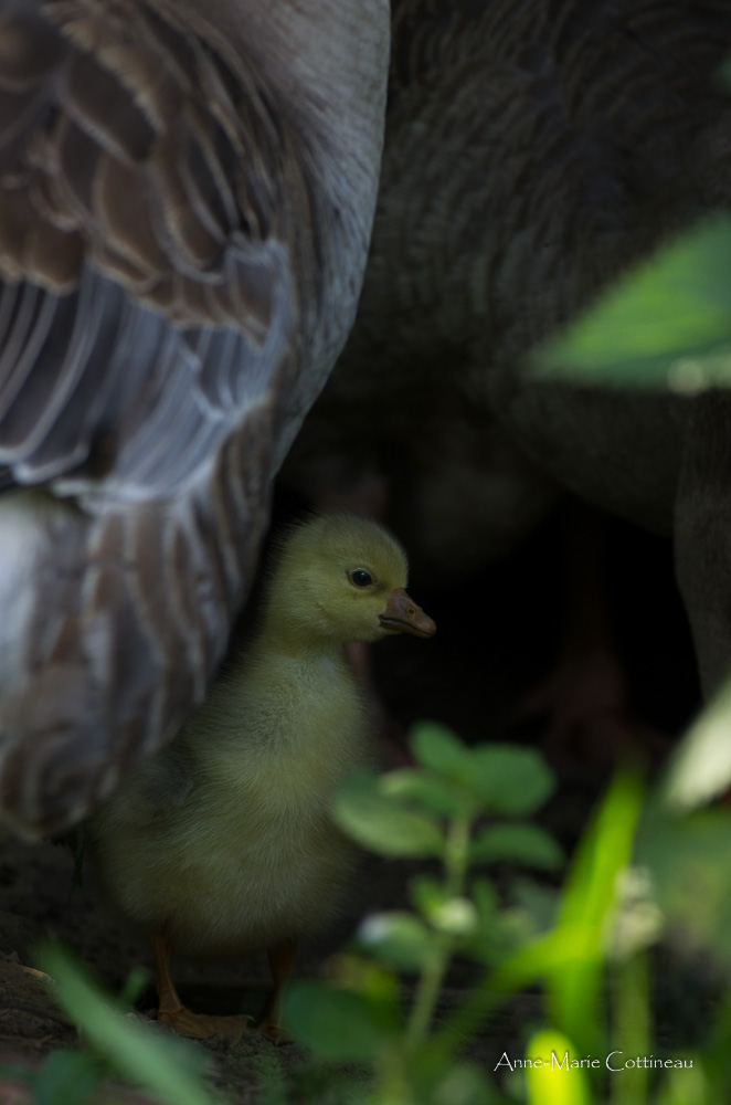Un petit oison de 3 jours à l'ombre de ses parents
