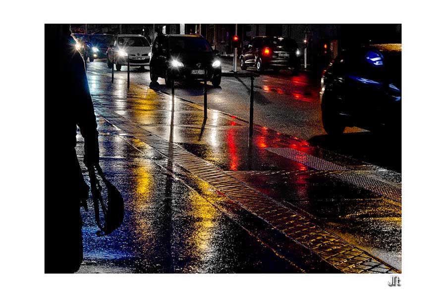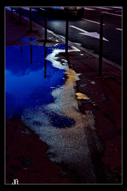 ... Elle est pourtant vraiment pas mal cette image ...Rien qu'une flaque, au crépuscule dépassé ; un bout de trottoir, un rien d'asphalte, à la lueur des phares ... Rien ... Et pourtant, toute l'irréductible complexité de la ville, irrévérencieusement manifesté par la tâche aléatoire de la flaque, dont la sinuosité s'oppose -sans pouvoir jamais s'y résorber - à la rectitude annoncée de l'organisation sociale (représentée par la route, la flêche, le passage clouté ...) ... même les "bites" d'amarrage qui s'y reflètent sont vouées à un destin contrefait ... Oui, vraiment pas mal ...