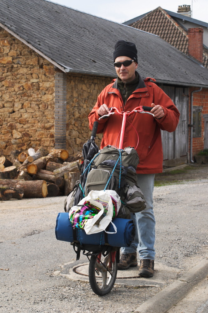 Rencontre au hasard avec "William the wanderer" équipé d'un drôle d'engin porte charge mono roue, grand voyageur de l'imaginaire, très certainement plus épuisant que son périple depuis Périgueux vers souvigny, ville étape sur une des nombreuses voies de Saint Jacques de Compostelle.
