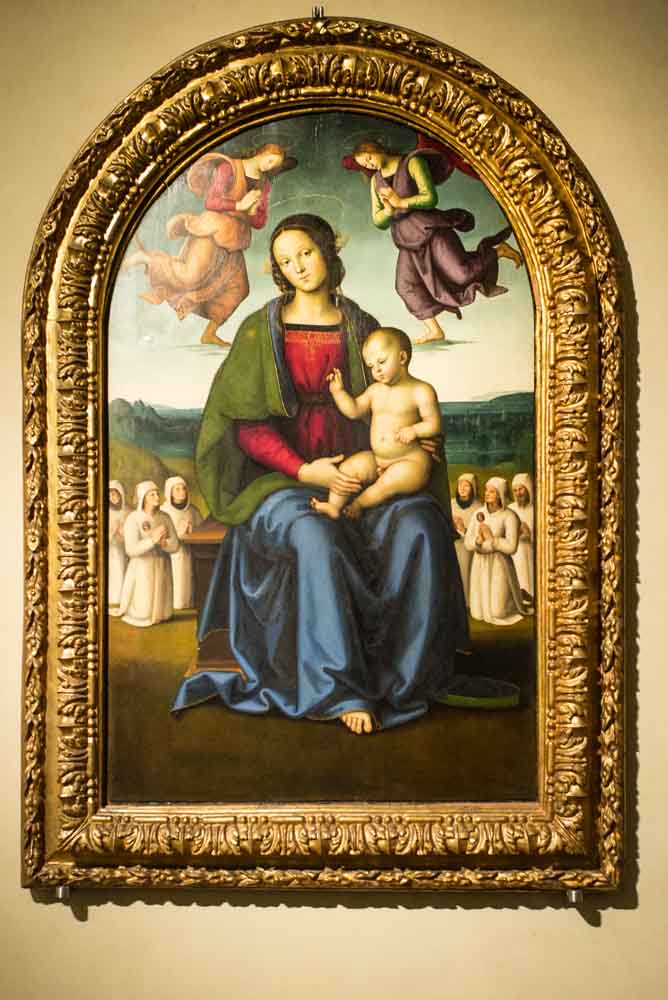 reflets, deformation ( on a pas d'escabeau sous la main); souvent photos interdites. Ici vous êtes devant une oeuvre du Pérugin ( XV eme s) à la pinacothèque de Perouse. limitation en ambiance sombre à 3200Iso à f4 et au 1/25eme...