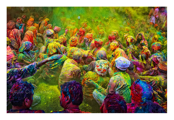 2. Mathura est beaucoup plus religieux et authentique, c’est la ville où le seigneur Krishna est né. La nuit du premier jour de la fête, un feu est allumé pour rappeler la crémation de Holika, une démone brûlée par Vishnu. Le deuxième jour, connu sous le nom de Rangapanchami, les gens, habillés en blanc, circulent avec des pigments de couleurs qu'ils se jettent l'un à l'autre ; le meilleur endroit pour attraper le lancement de couleurs est Dwarkadheesh Temple à Mathura. Tout ceci dans une ferveur beaucoup plus seine, il y sera plus facile d’y circuler pour des photographes, enfin en prenant quelques précautions.