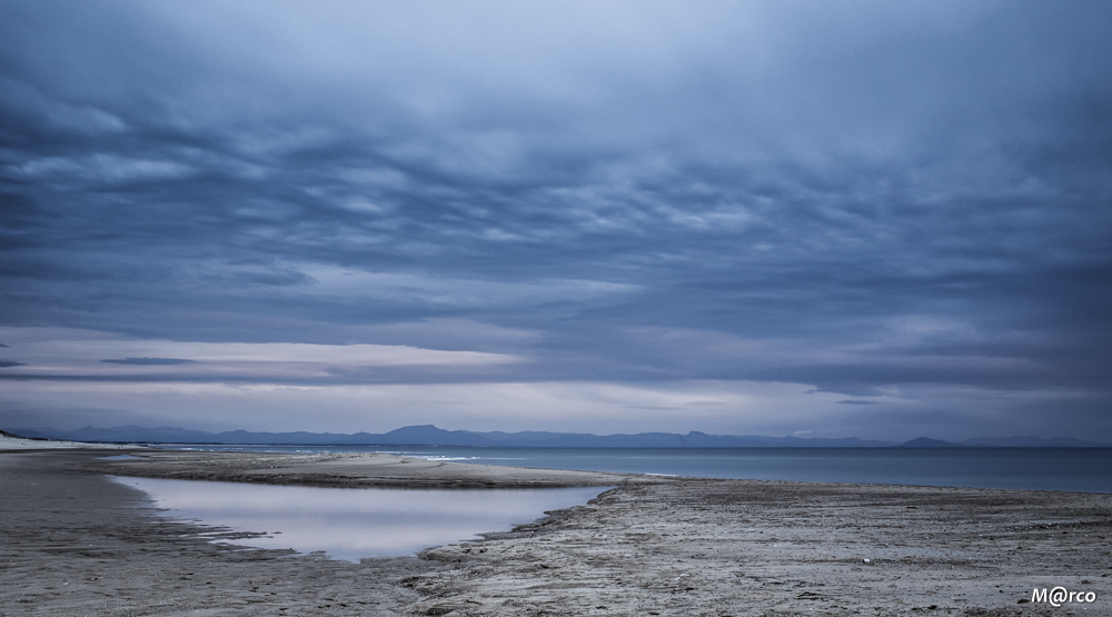 coucher de soleil sur la mer à Capbreton, et soirée nuageuse sur une plage d'Hossegor avec les pyrénées atlantiques en fond
