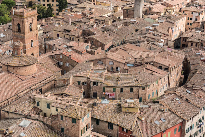 Et oui sienne et sa piazza del campo inclinée, divisée en 9 quartiers par des lignes de pierre comme les 9 membres du Governo dei nove. Place où a lieu le Palio course où 10 cavaliers représentant chacun une contrade font une course folle en montant à cru.