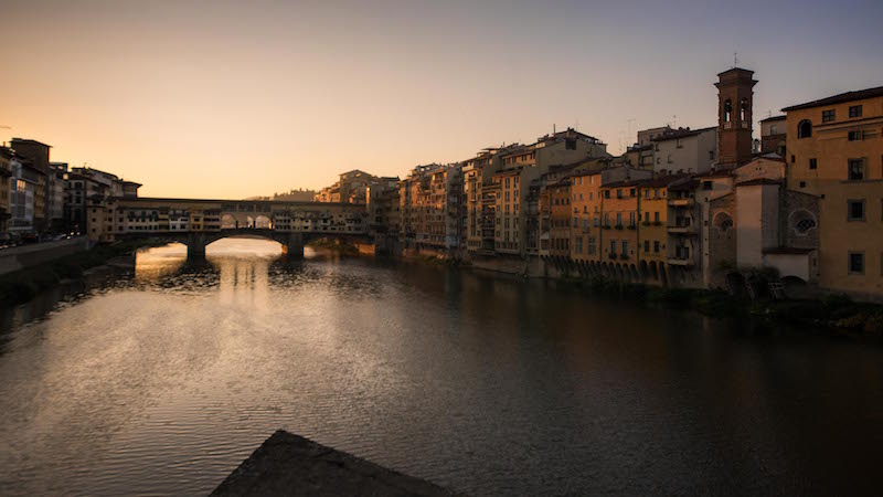 Florence, les bords de l'Arno et le ponte vecchio avec le corridor de Vasari qui a vu passer plus d'un Médicis!