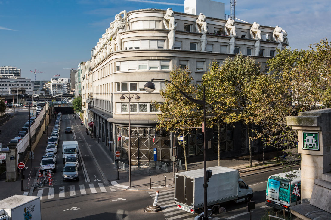 Cet immeuble surmonté de 13 statuts rappelant le gaulois mourant visible depuis la coulée verte à Paris n'est autre que le commissariat du XII eme