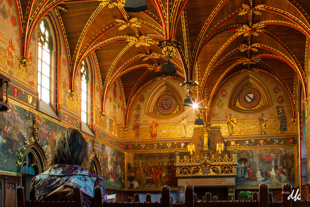 ...dans l’hôtel de ville à Bruges. Pendant le temps qu'il a fallu pour installer (exposition 2,5s) Isabelle regarde le guide.