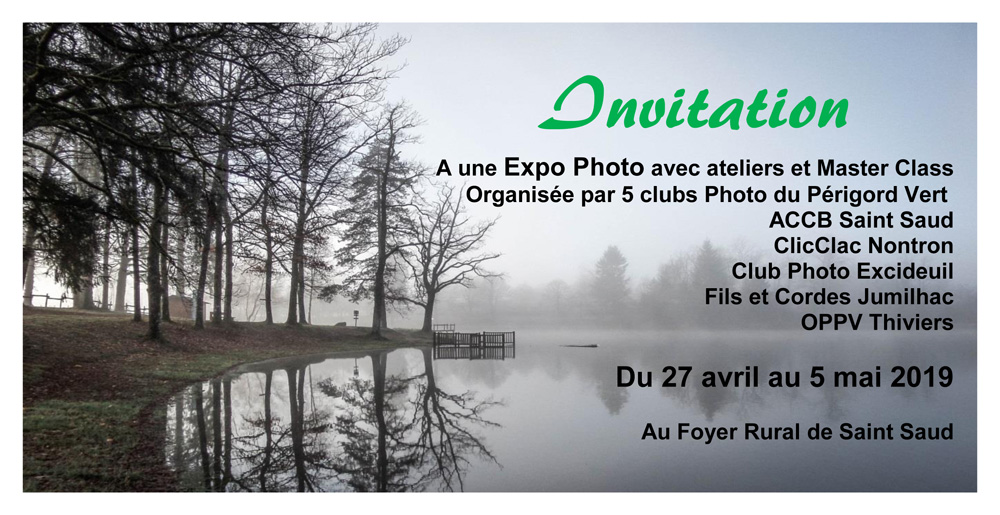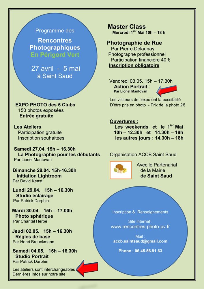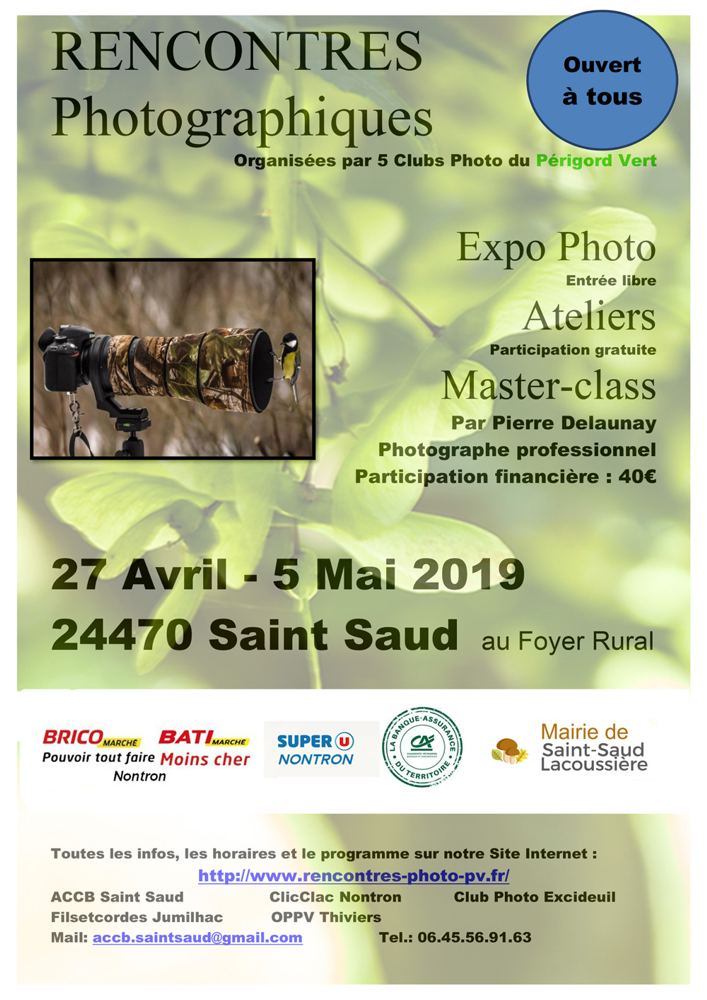 Du 27 avril au 5 mai : les Rencontres Photo en Périgord Vert. 5 Clubs photo du Périgord Vert organisent une expo et plusieurs ateliers à St Saud Lacoussière. Ouvert à tous !