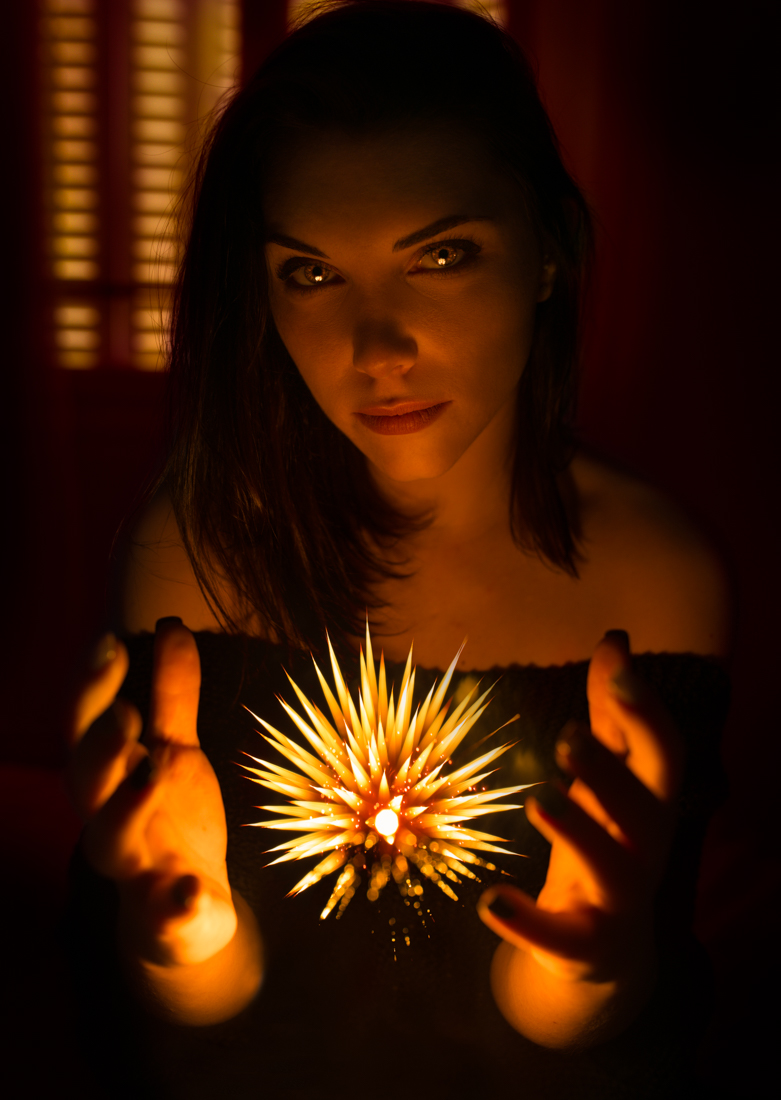 Beau portrait, j'adore ces ton chauds. Par contre ça fait bizarre que le truc lumineux soit net alors que ses mains ne le sont pas.