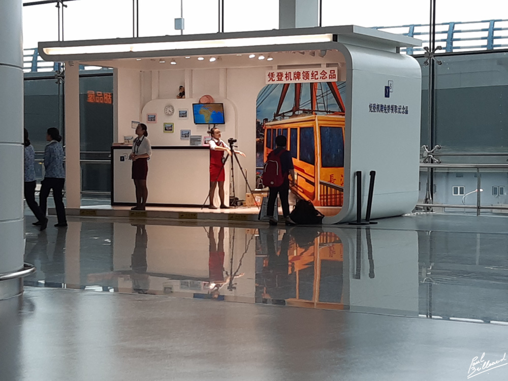 Aéroport de Chongqing : si lors de votre visite, vous n'avez pas pu tout visiter, pas de problème, on vous prend en photo devant un fond représentant un monument ou le mythique téléphérique permettant de traverser le fleuve, et c'est gratuit !!!!