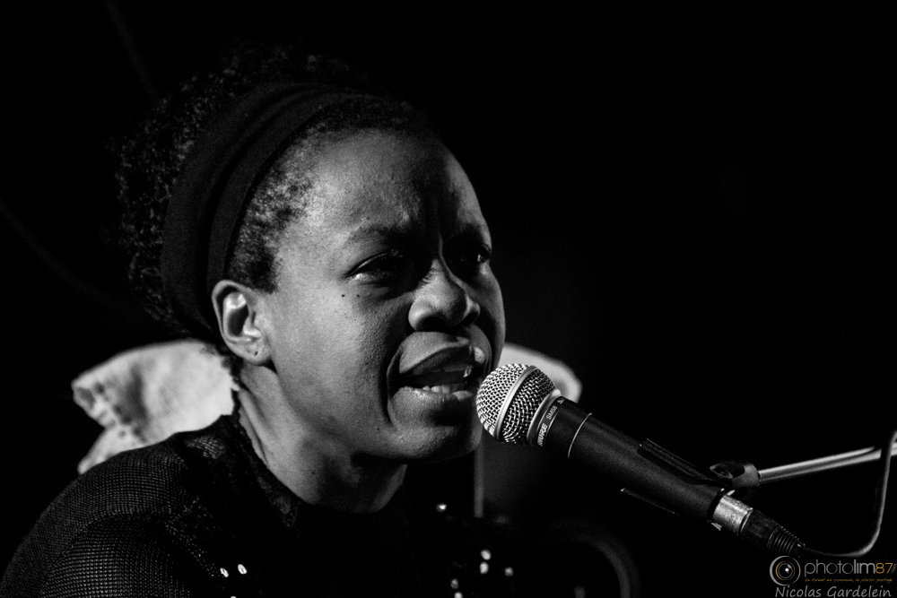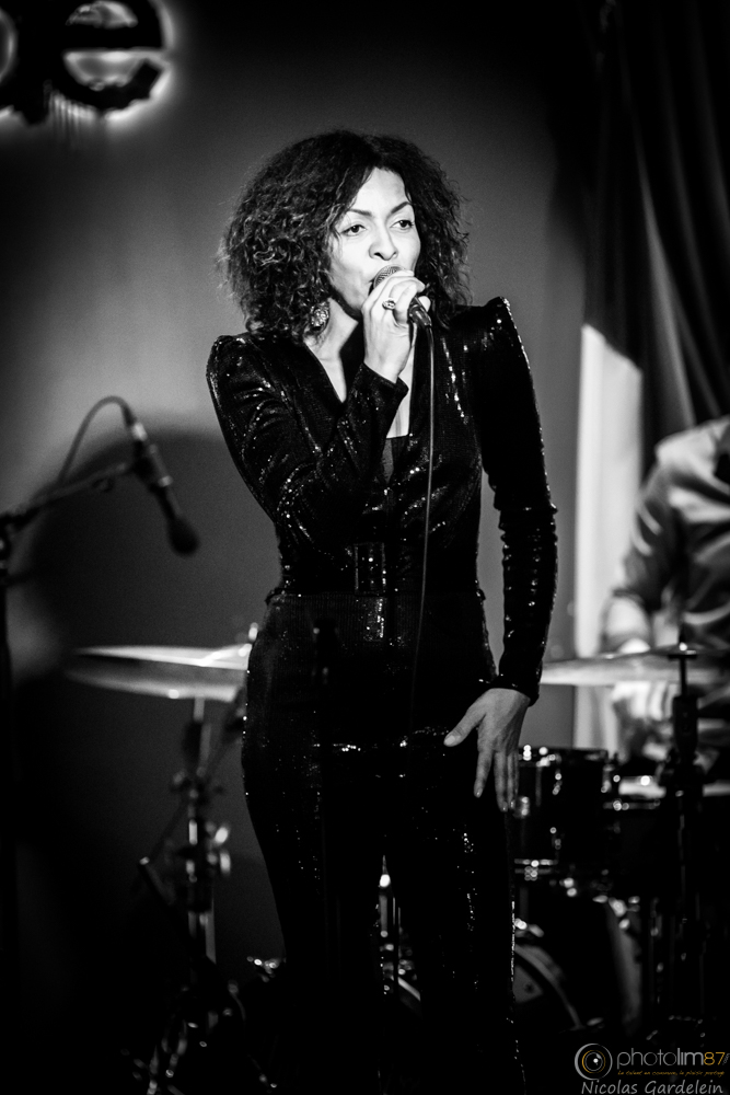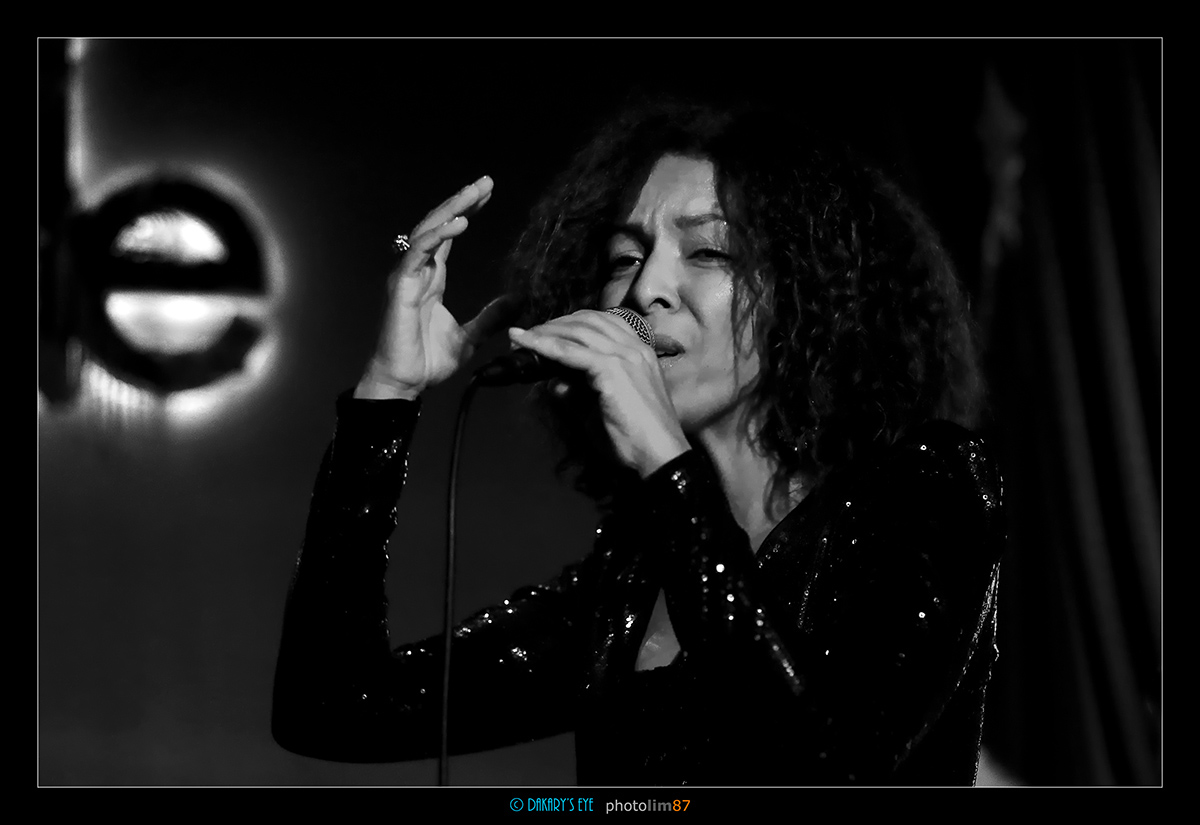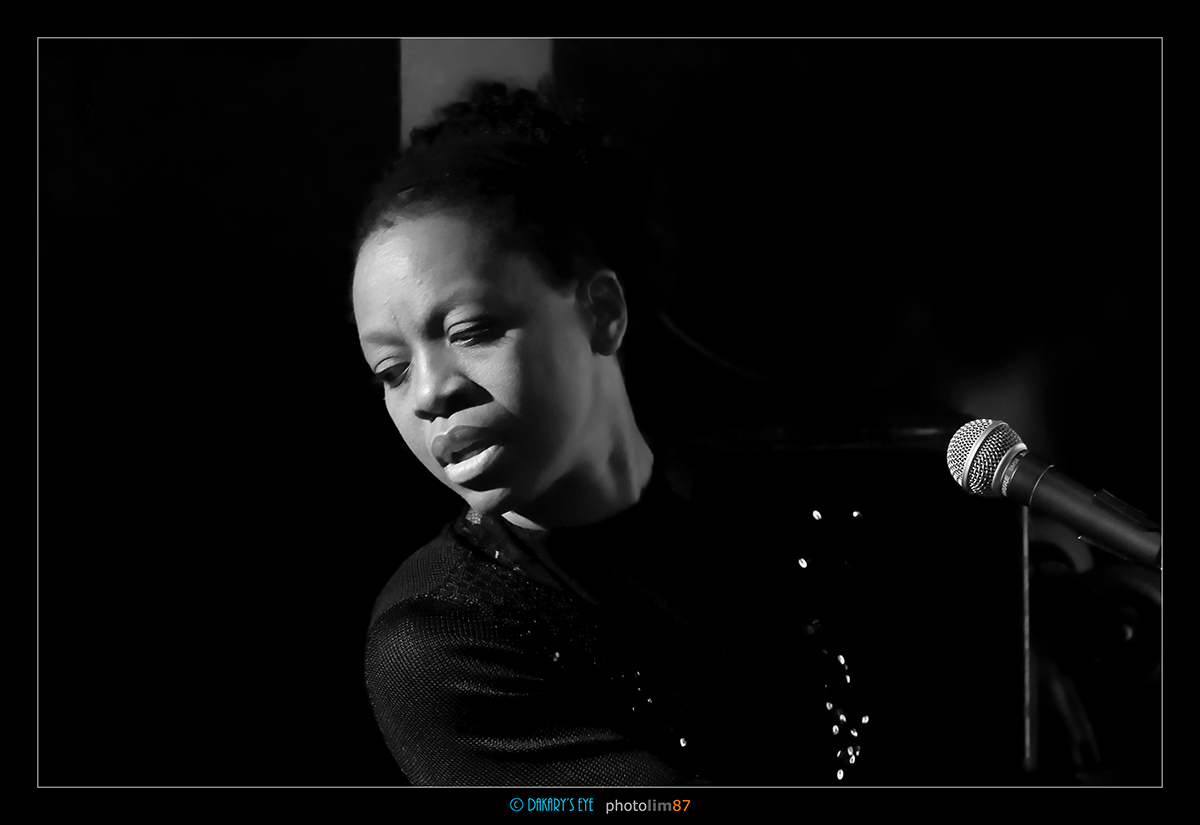 LISA DOBY à l'Ambassade. Une belle black, habillée toute en noir et les machinos qui avaient perdu le bouton de la lumière. Ca permet de tester un shooting à 10000Iso