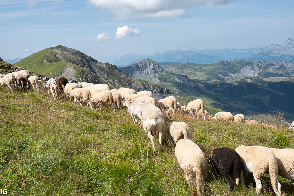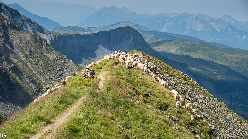 Besoin de voir du Pays? Je vous emmène dans les Alpes. Ce troupeau de 500 bêtes est parti de Megève pour venir en Alpage sur les pentes du Mont Joly. Il y a en core 2 ans les moutons y paissaient librement. Actuellement et suite à des attaques de loups il faut au minimum des bergers en permanence et souvent des patous .... (non je n'essaie pas de vous faire croire que ces chiens là sont des patous des Alpes, ils étaient 100m plus bas avec un autre troupeau)