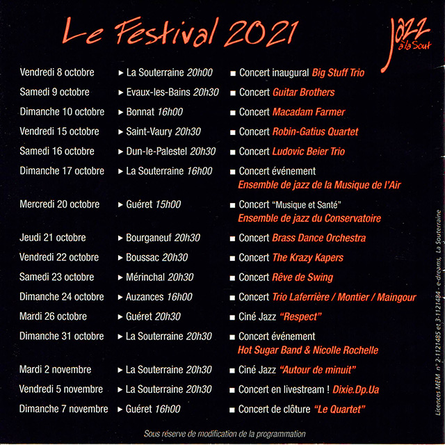 Voilà le programme de Jazz à La Sout 2021 ; pour ceux qui sont intéressés, inscrivez vous sur ce post, DEAD LINE LE 28 SEPTEMBRE minuit ; comme d'habitude, je vous indiquerai vos possibilités de shoot en fonction du nombre de demandes et des capacités de chaque salle.