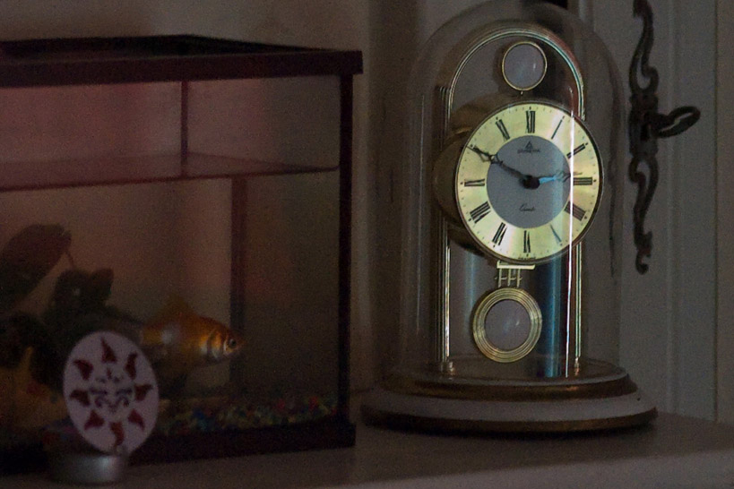 1/50 à 3,5 25600 iso pour le poisson rouge qui regarde l'heure et