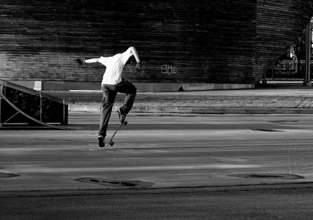ben moi je ne partage pas l'avis du blaireau et de Seb......;)....justement cet espace devant il apporte de l'air et de l'espace à cette photo dont on besoin ces skateurs....de plus juju tu saisis un beau mouvement en l'air....bon après certe ce n'est pas la photo du siècle qui va révolutionner le monde du skate...mais pour moi celà reste une photo agréable à regarder......et le NB lui va bien.....et je ne dis pas ça parce que j'ai le même type de pdv hein:rolleyes::lol:;)