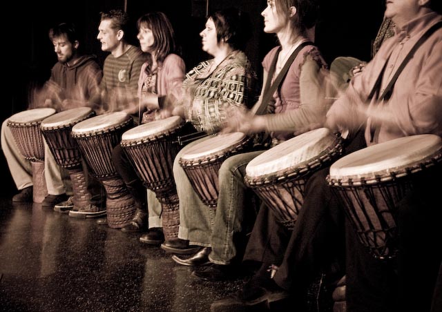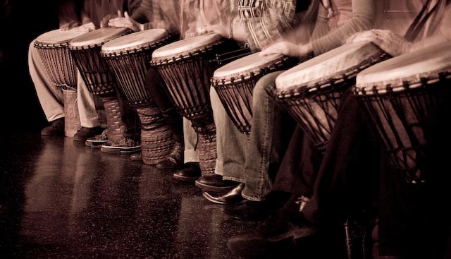sympa celle ci! j'aime bien l'idée des djembés alignés, par contre, quitte à recadrer dans un format allongé, j'aurais volontiers recadré encore plus serré, en éliminant la partie en bas à droite... et par contre j'aurais aimé voir un peu plus les musiciens pour que le dernier de soit pas réduit que à l'état de main...