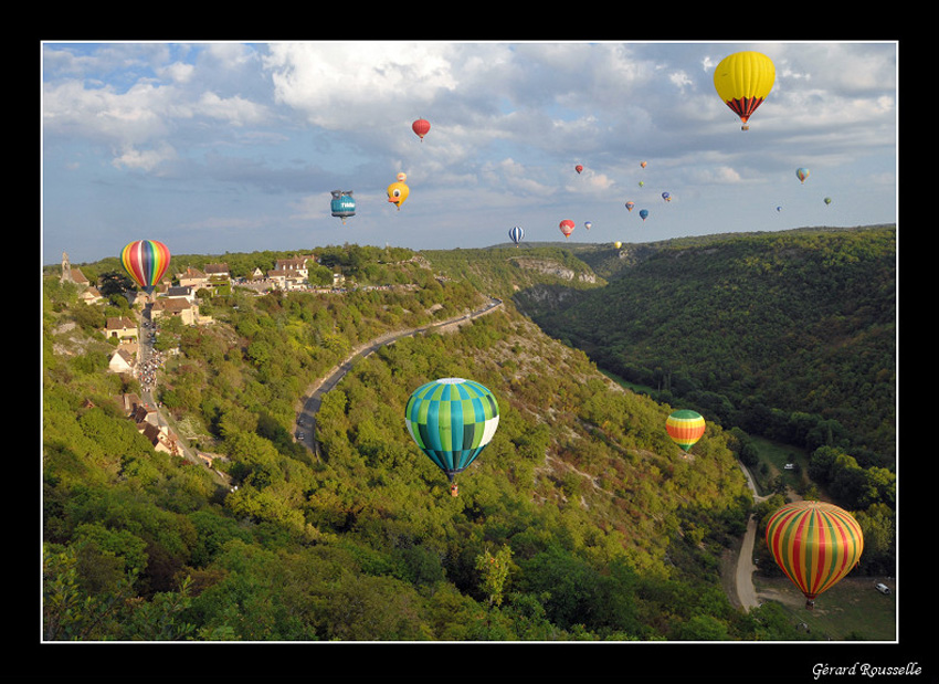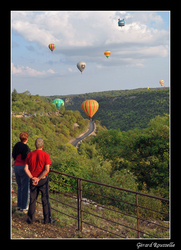 bon finalement j'y suis allé,arriver a 10h,j'ai vu les mongolfieres s'arracher du sol a 18h15 ,geniale l'attente,j'y refoutrais plus l'objectif,ou alors au premier envol le matin a 8h,le rocher des aigles n'ouvre ces portes qu'a 14h,je me suis fait ch..r comme un rat, et en plus le vent les a poussées a l'opposé du site de Rocamadour (pour le fond)
