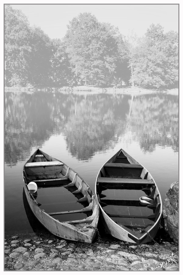 J'ai essayé de gérer le fort contraste entre les barques à l'ombre et l'autre rive en plein soleil. Tout en gardant le cadrage de la pointe des barques par rapport aux reflets des arbres dans la rivière...
